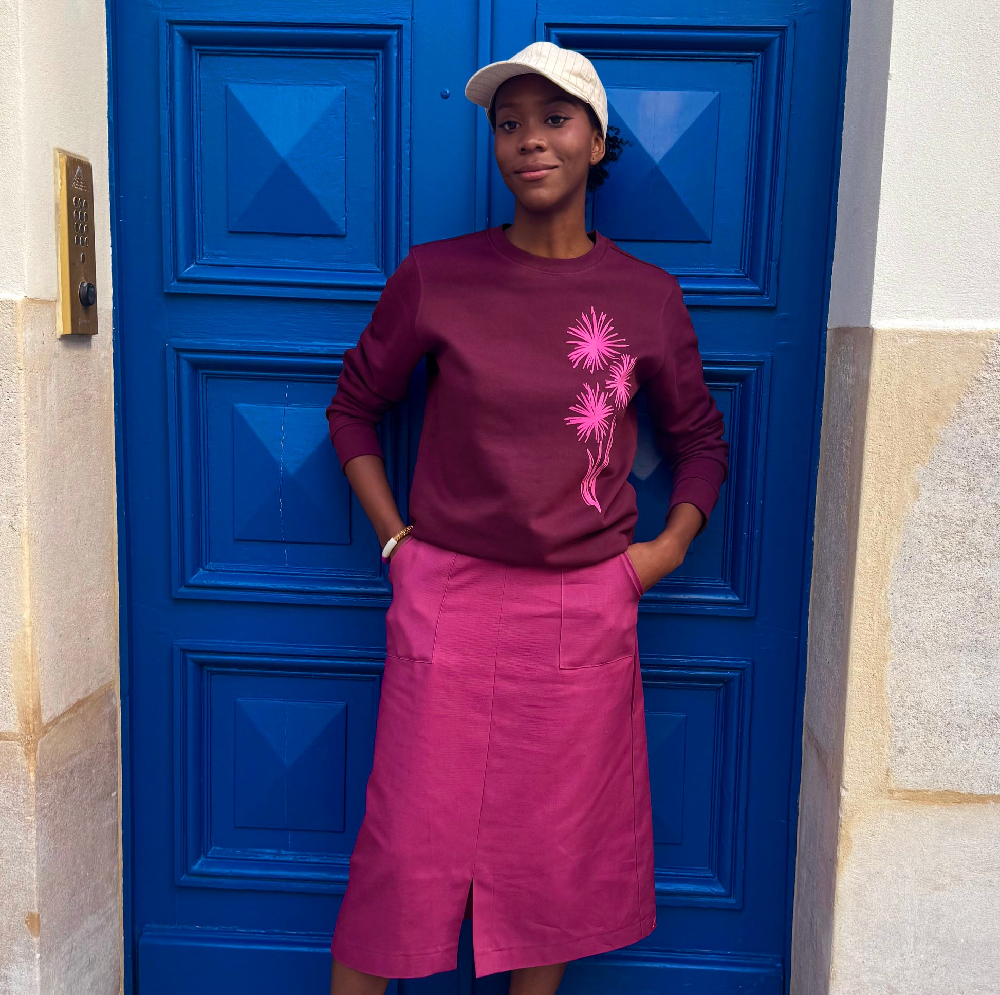 Sweat en coton Oekotex (fabriqué de manière écoresponsable ) prune motif fleurs "Feu d'artifices"en velours rose.Lavage machine à 30° sur l 'envers. Volume droit taille normalement.