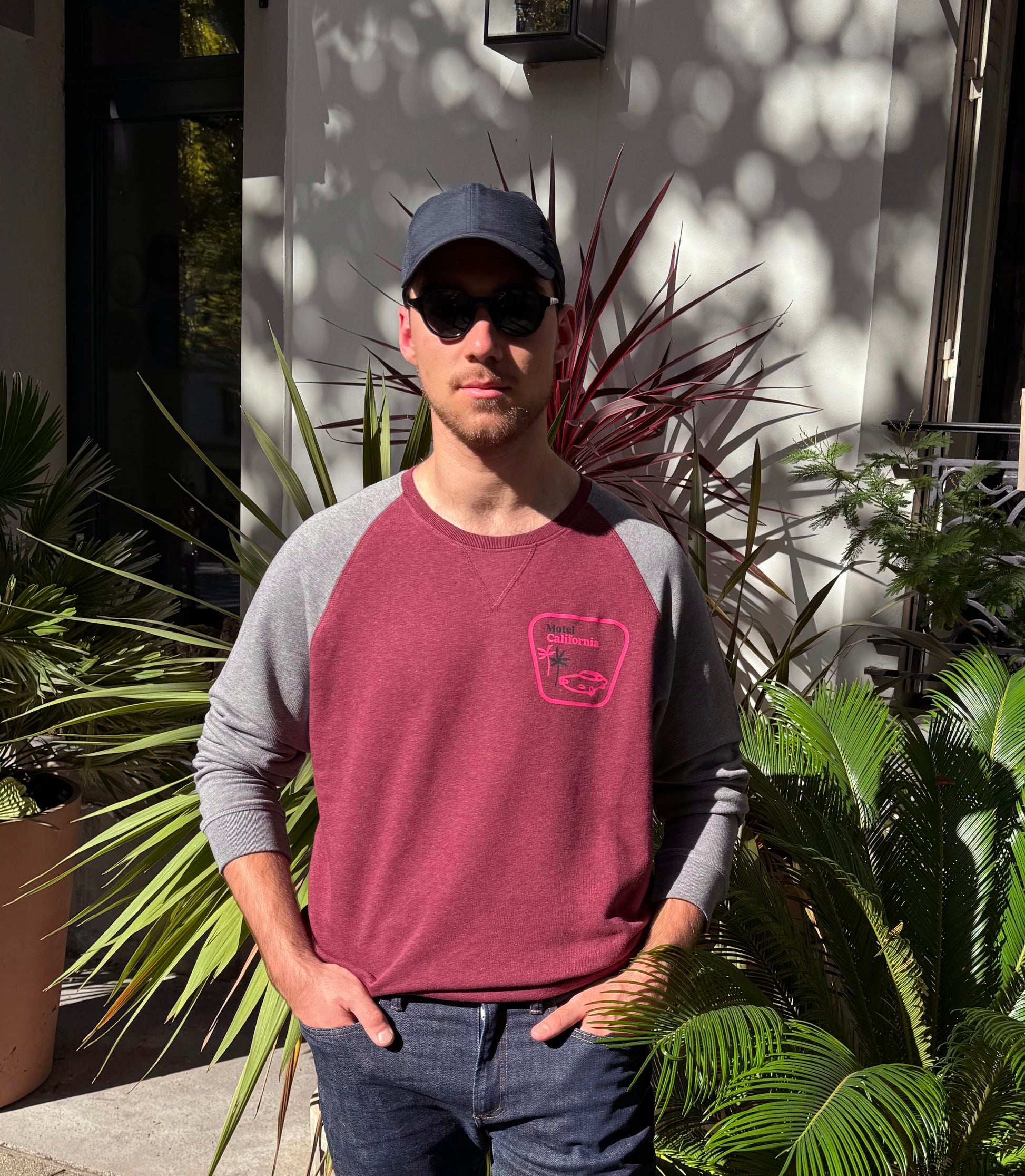Sweat en coton Oekotex ( fabriqué de manière écoresponsable) bicolore bordeaux et gris avec motif "Motel California" clin d'oeil à la chanson du groupe Eagles "Hotel California". coupe droite lavage machine à 30°