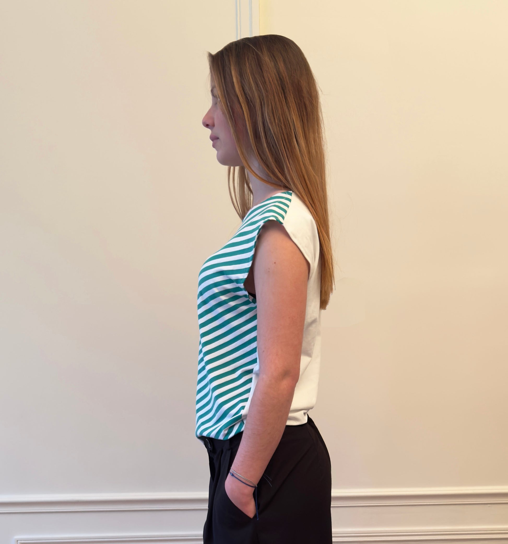Top à rayures sur le devant en biais ecru et vert, dos ecru uni, en viscose élasthane, fabriqué en France. Lavage en machine à 30 °