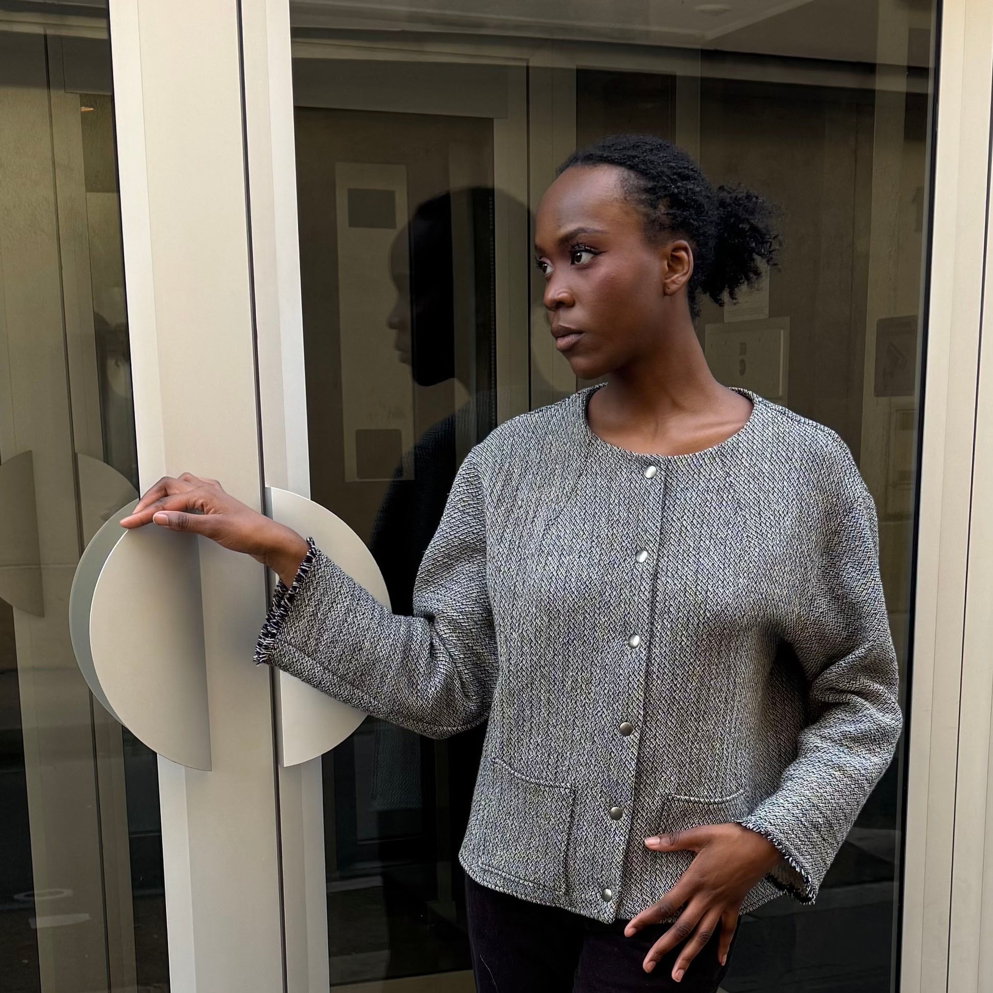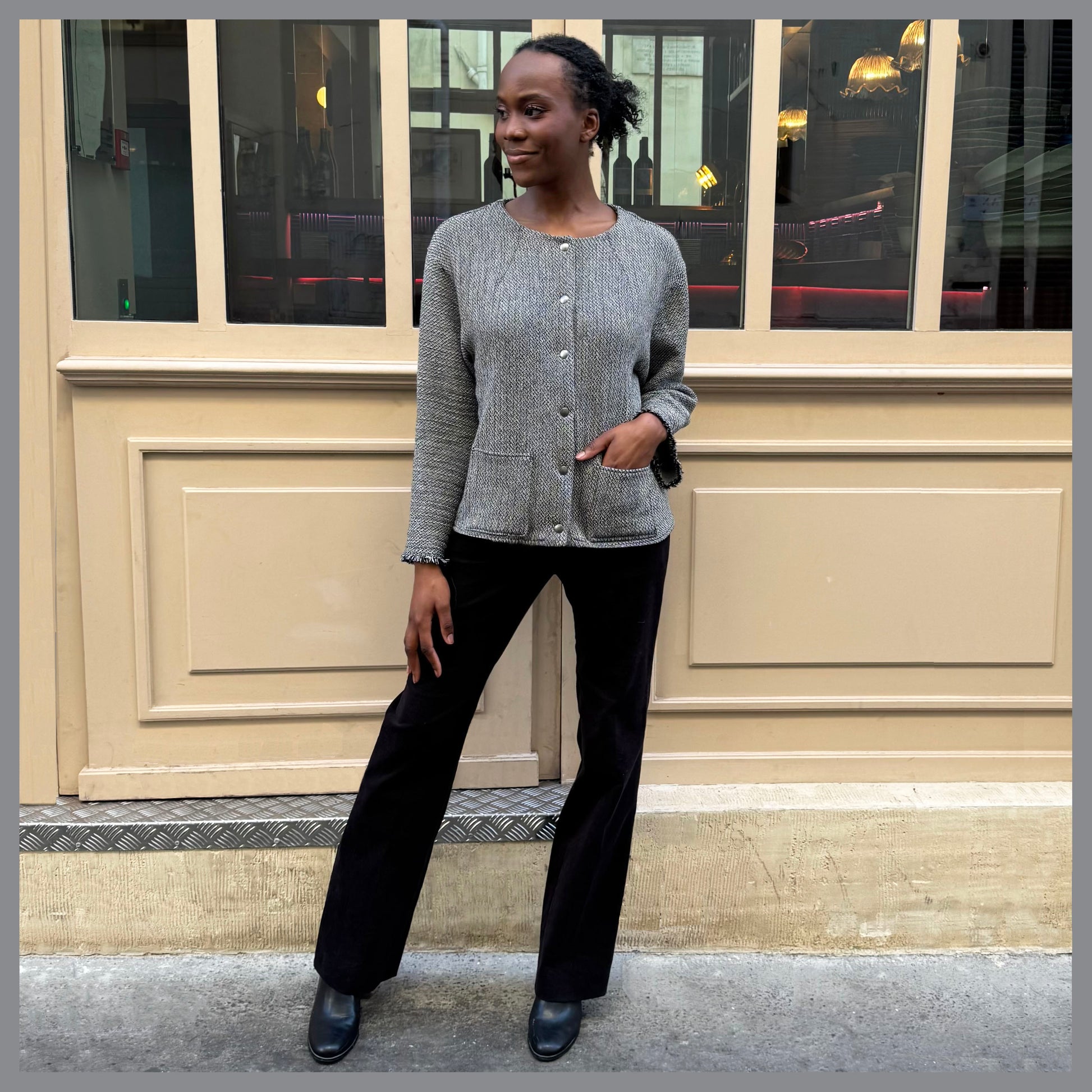 Veste en molleton de coton gris chiné boutons pressions sur le devant, bas thermocollé pour plus de tenue, manches frangées en bas, fabriquée en France lavage à 30° machine taille unique ( possibilité de sur commande pour autre taille pour tout renseignement olivierbattino@hotmail.com)
